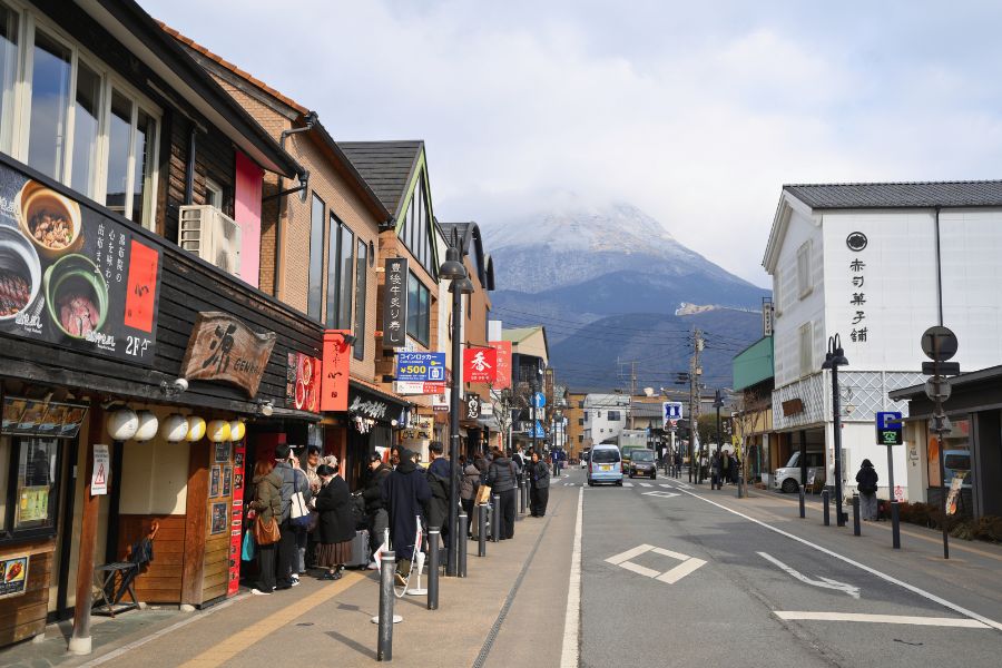由布院の風情ある街並を味わいながらも、ご当地グルメや大分県の特産品を扱う土産屋さん、酒屋、飲食店などジャンルに富んだ店が軒を連ね、観光客で賑わっています。
